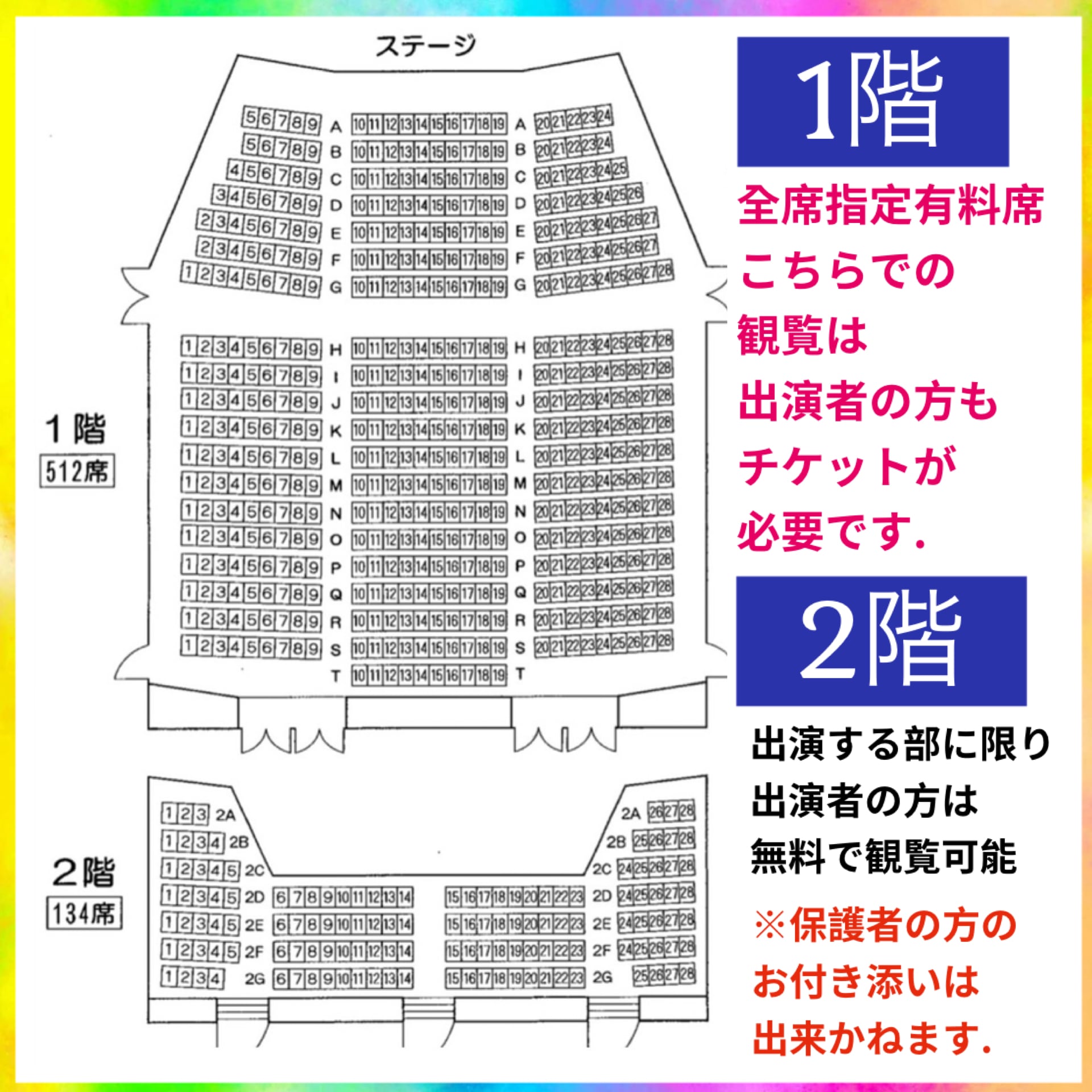 ★2階席:出演者の観覧席として開放いたします。自分が出演している部に関しては、こちらに限りチケットなしでご観覧いただけます。(お付き添いの方はお入りいただけません。)